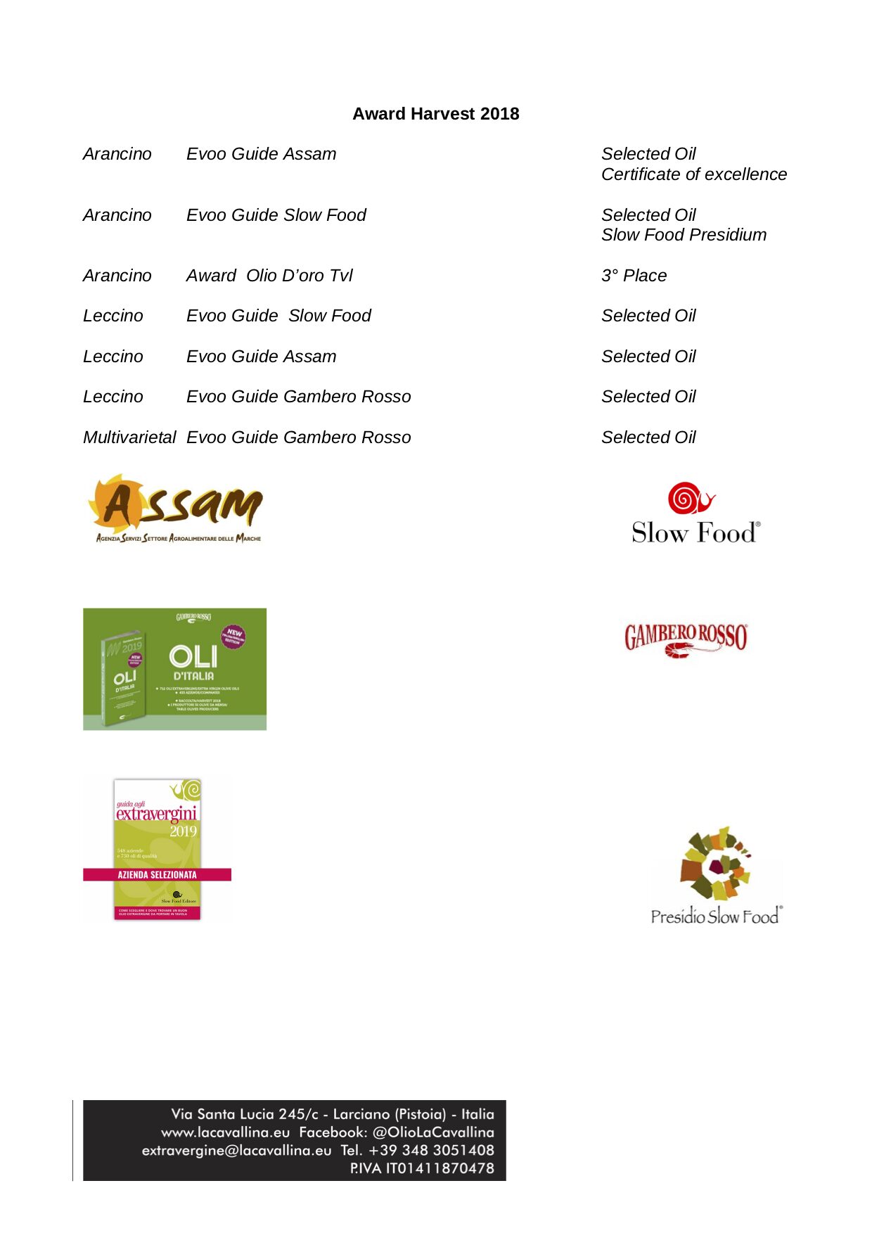 La Cavallina oils awarded by Slow Food