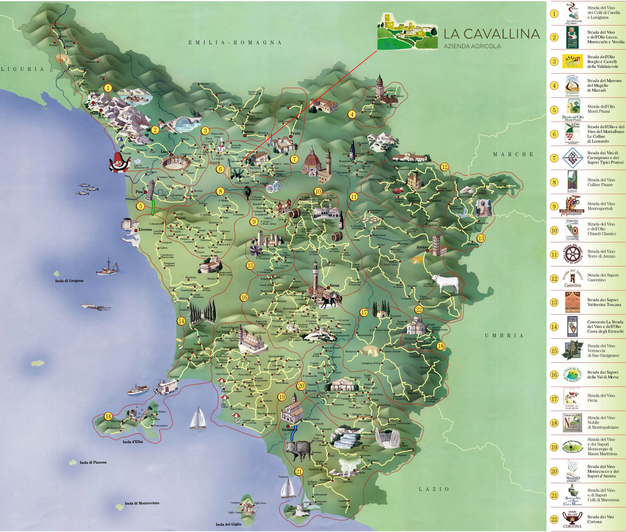 Ci troviamo in una posizione strategica per poter vistare i più importanti siti turistici della Toscana, e per le camminate senza prendere la macchina, ci troviamo lungo il Percorso n. 26 “Larciano Castello – Cecina” della rete sentieristica CAI (8km), che regala bellissimi panorami e suggestivi scorci.